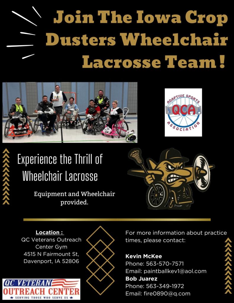 Our “Iowa Crop Dusters” wheelchair lacrosse team plays competitively and recreationally. Practices are held at the QC Veterans Outreach Center. We are looking for additional athletes! Equipment and wheelchairs are provided. The program was established in 2025.